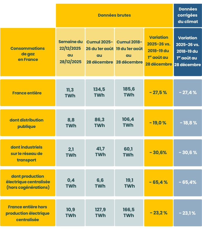 Cette baisse résulte d'une réduction significative des consommations des distributions publiques et des grands industriels raccordés au réseau de transport, ainsi que d'une moindre sollicitation des centrales électriques au gaz.